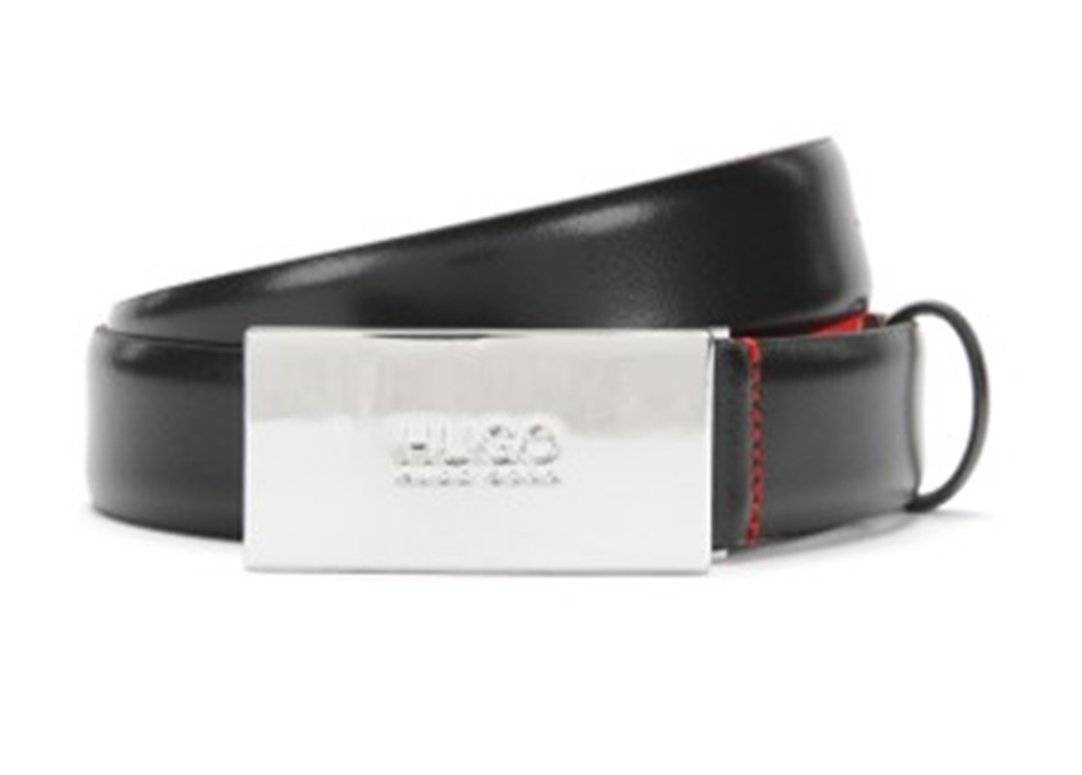 DIESER GÜRTEL VON HUGO MIT DEM NAMEN BALDWIN-N .PERFEKTER GLATTLEDER GÜRTEL IM KLASSISCH STIEL MIT RÜCKSEITIGEM ROTEM FARBAKZENT.