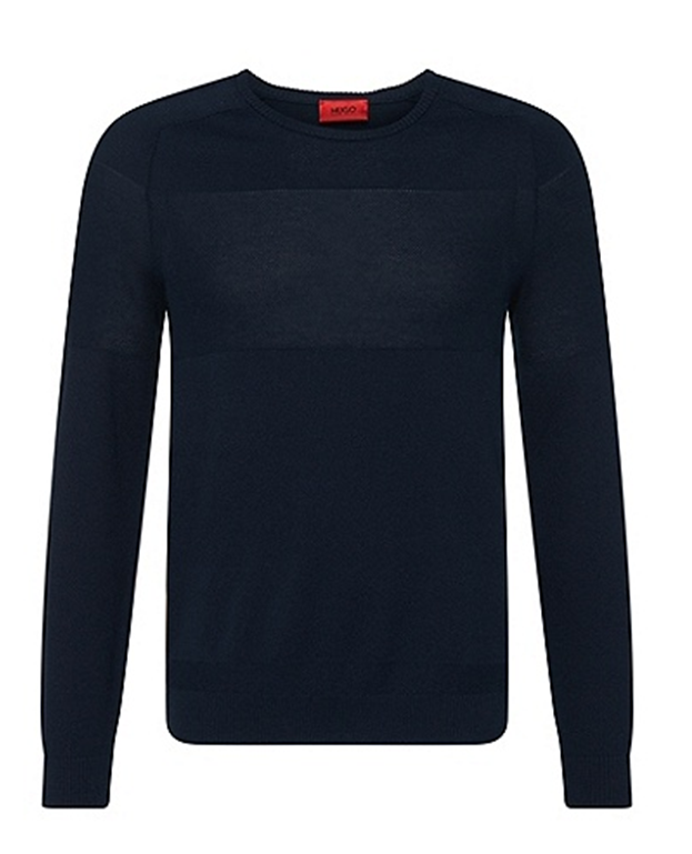 DIESER PULLOVER VON HUGO MIT DEM NAMEN SBAND .UNIFARBENER SCHMAL GESCHNITTENER PULLI AUS FEINER WEICHER BAUMWOLLE .DAS STRICKMUSTER IM BRUSTBEREICH SETZT EINEN NEUEN AKZENT .