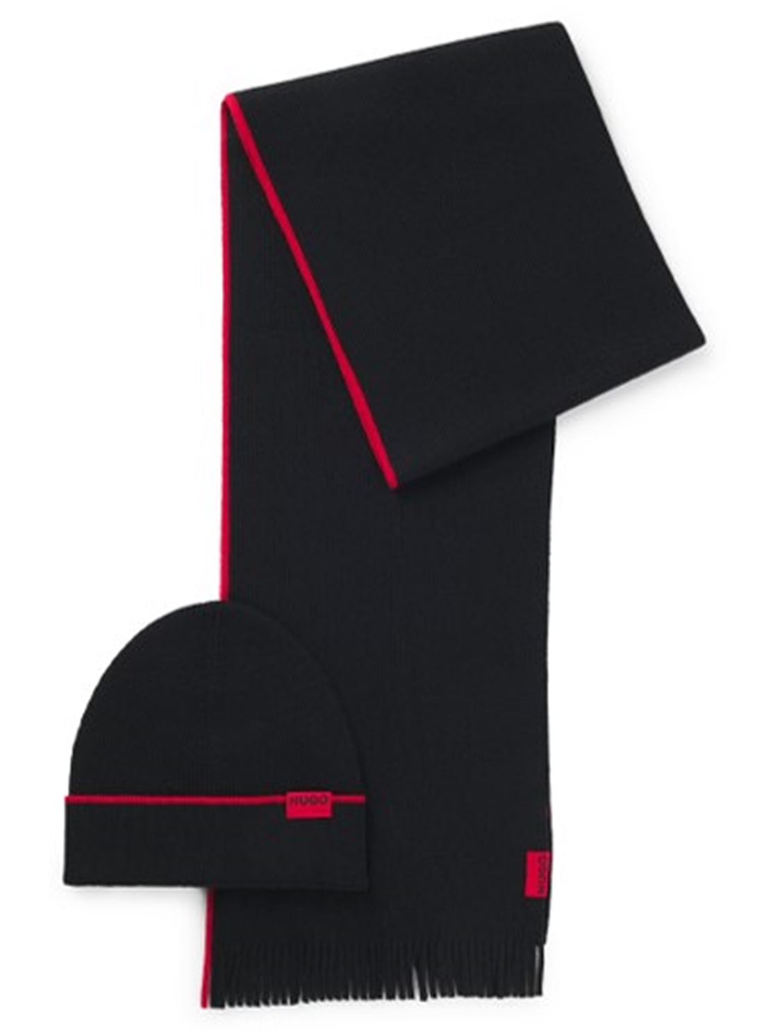 Minimalistisches HUGO Set aus einem Schurwoll-Mix. Mütze und Schal sind mit kontrastfarbenen Streifen und roten Logo-Labels versehen.