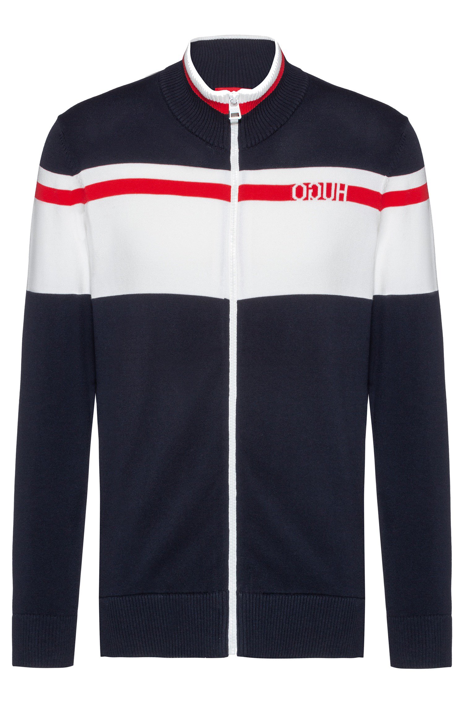 DIESE STRICKJACKE VON HUGO MIT DEM NAMEN SJACKETO . SPORTLICHE STRICKJACKE AUS EINEM ELASTISCHEN PIMA BAUMWOLL MIX QUALITÄT .MIT BLOCKSTREIFEN UND STEHKRAGEN .