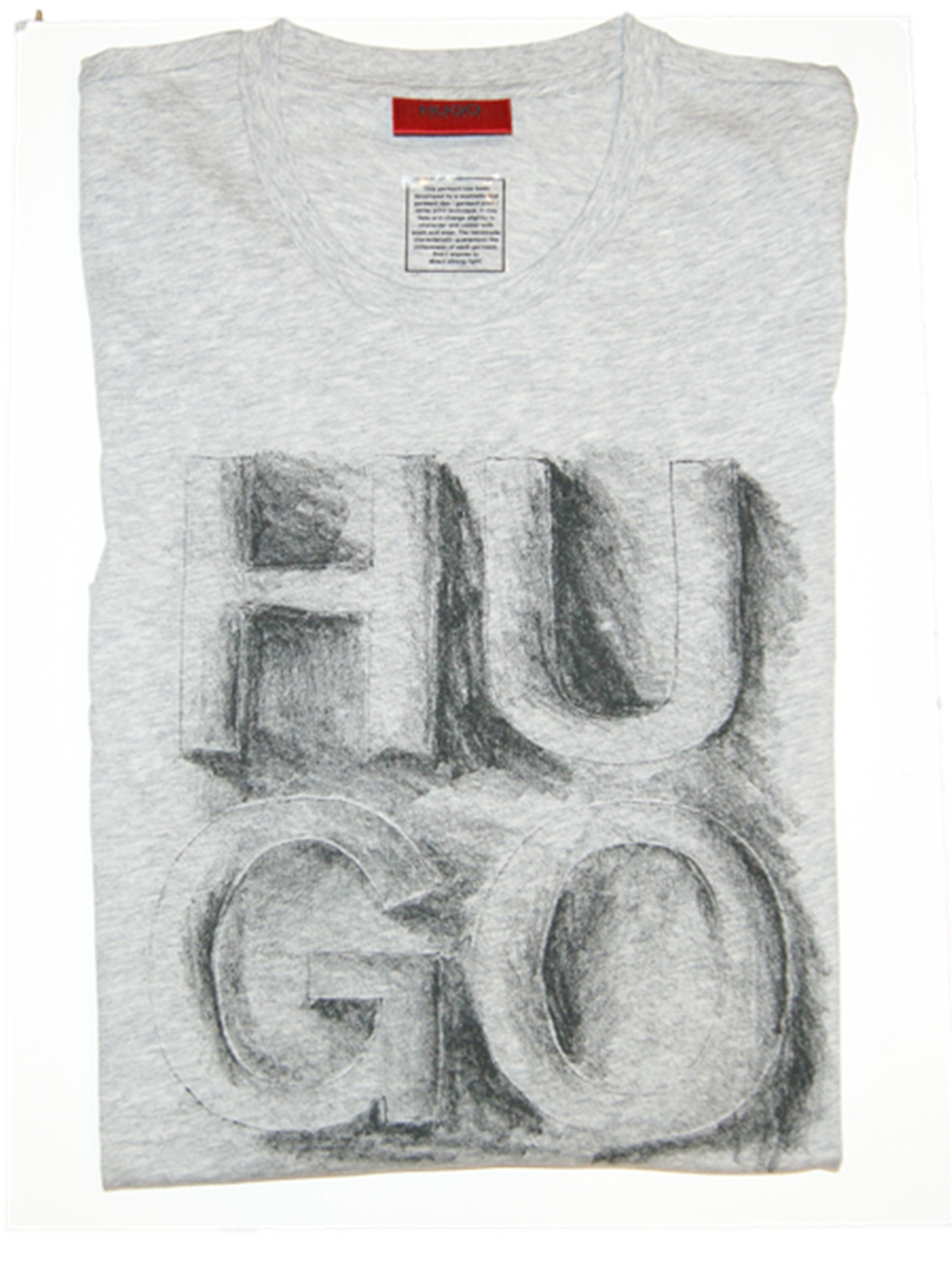 DIESES TEE SHIRT VON HUGO MIT DEM NAMEN DONTI ,LANGARM TEE SHIRT MIT DEM AUFDRUCK HUGO ALS  BLEISTIFT ZEICHNUNG .