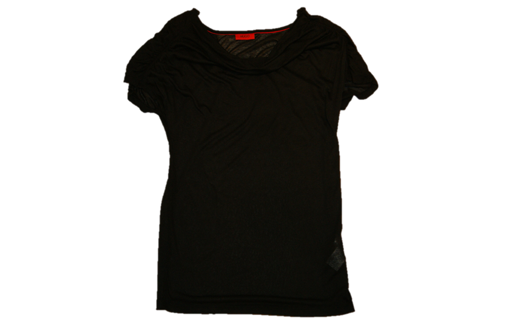 DIESES TEE SHIRT VON HUGO WOMAN MIT DEM NAMEN DISKY WUNDERSCHÖNES UNIFARBENES TEE SHIRT MIT WASSERFALL AUSSCHNITT UND RAFFUNGEN AN DEN ÄRMELN .