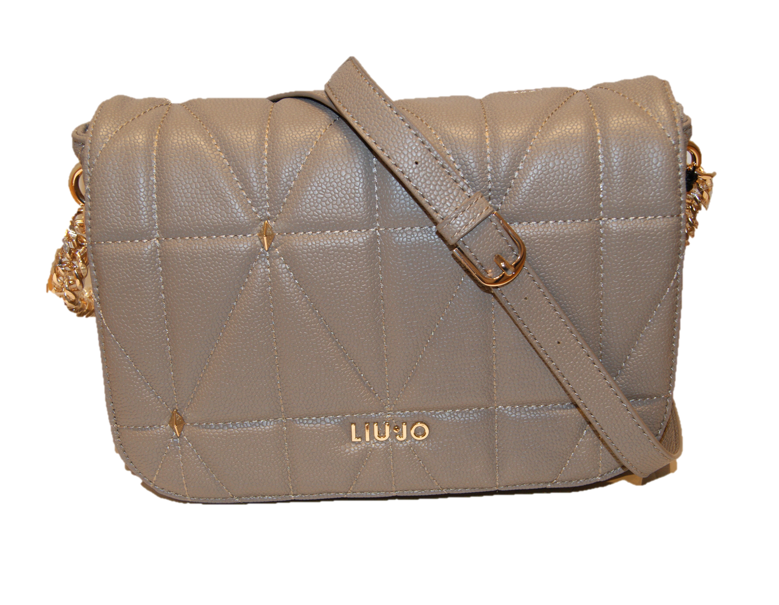 DETAILS : UMHÄNGETASCHE - SCHULTERGURT MIT TRAGEKETTE GRÖSSEN VERSTELLBAR - NIETENBESATZ- LIU JO LOGO .