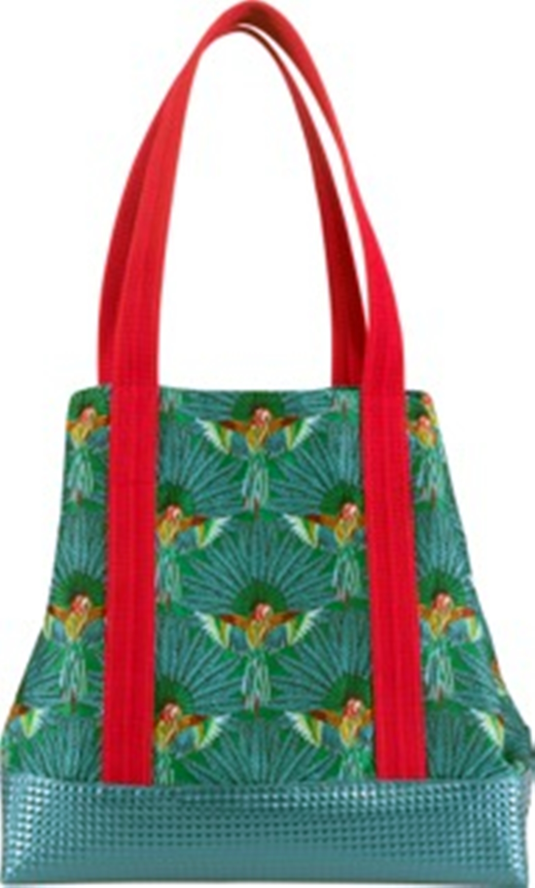 Sie ist aus einem exotischen dunkeltürkis/grünem Jacquardstoff mit vielen kleinen Papageien und einem petrolfarbenen Kunstlederboden in Pyramiden Sruktur. Die roten Trageriemen sind sehr strapazierfähig.