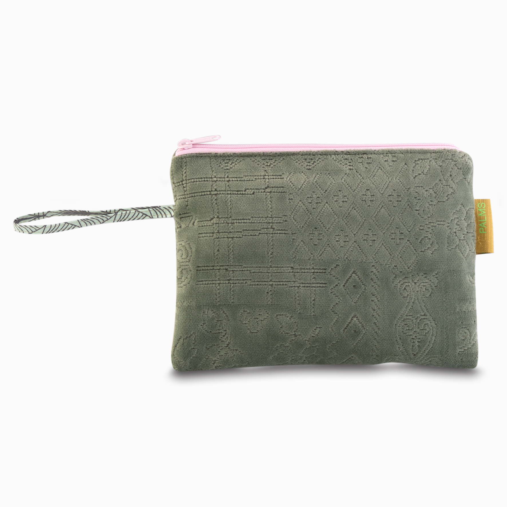 Durch ein fest eingenähtes Stoffband mit verbundenem Karabinerring wir die Clutch zusätzlich noch gesichert