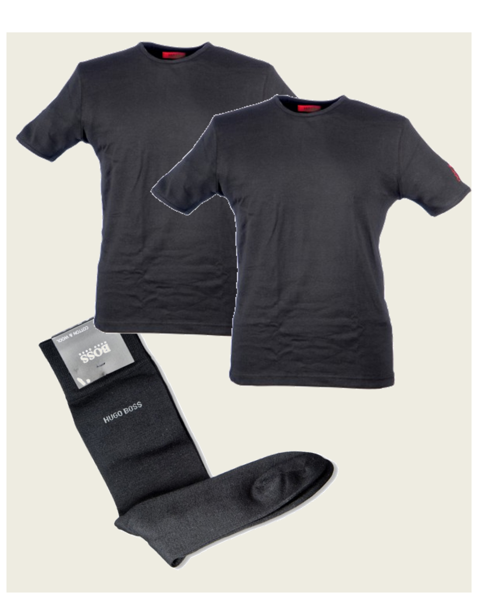 Kombipaket bestehend aus den 2er Pack Double Round T-Shirt in schwarz oder weiß sowie schwarzen Socken von Hugo Boss. Der Gesamtwert des Paketes beträgt 52 Euro.