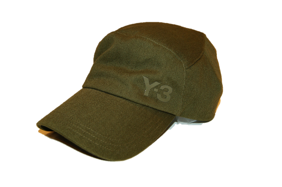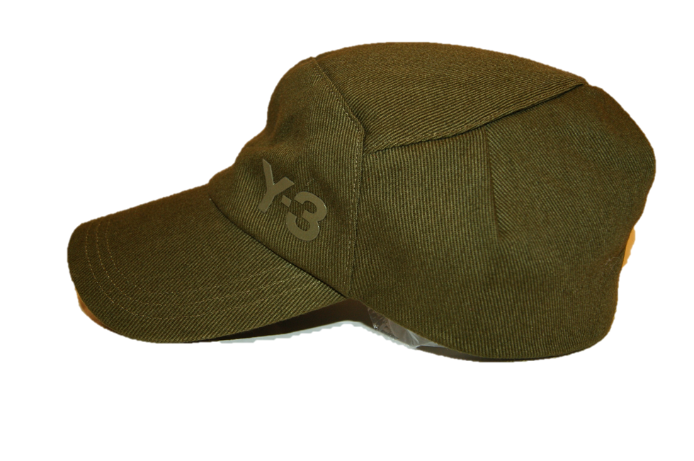 DIESE CAP VON Y3 MIT DEM NAMEN MILITARY UNIFARBENE CAP MIT GUMMIERTEN Y3 LABEL IN FRONT DER CAP .