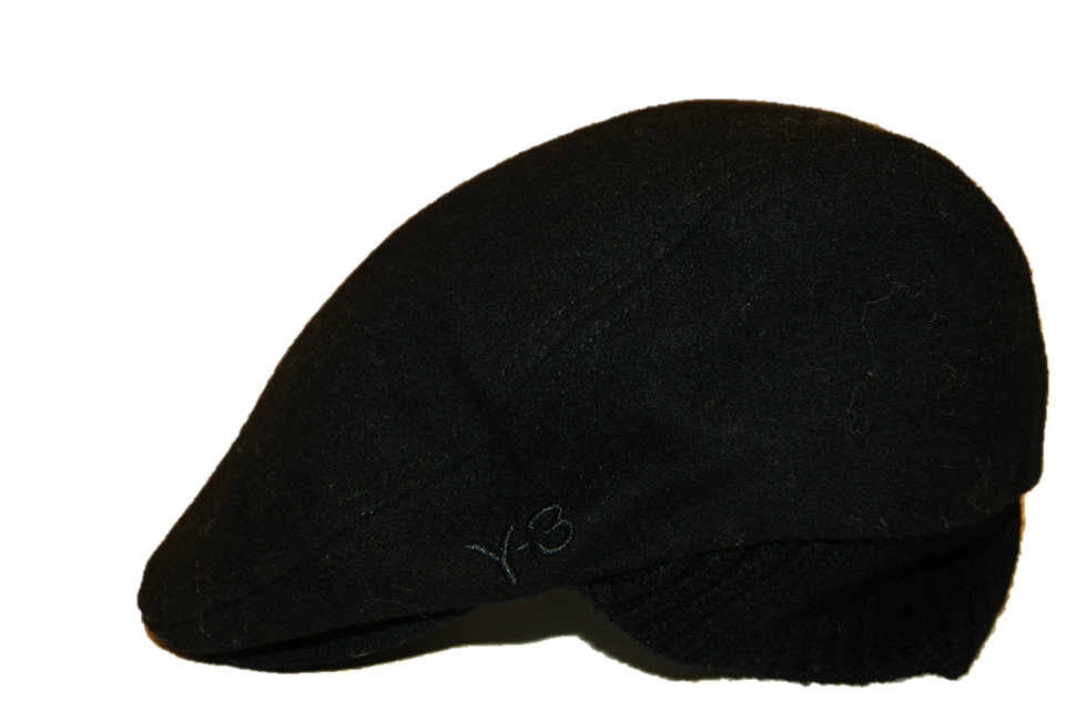 DIESE SCHIEBERMÜTZE VON Y3 MIT DEM NAMEN B UNIFARBENE SCHWARZE MÜTZE MIT GESTICKTEM Y3 LABEL AN LINKEN SEITE DER MÜTZE .